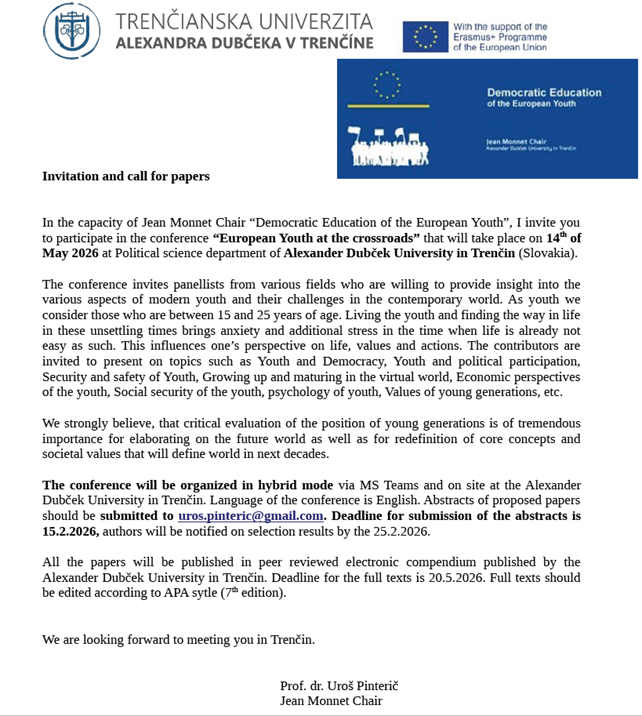 More information is HERE.----------------------------------------------------------------------------------------We invite you to participate in the conference “European Youth at the Crossroads”, which will take place on 14th of May 2026 at Political Science Department of Alexander Dubček University in Trenčin (Slovakia).The contributors are invited to present on topics such as Youth and Democracy, Youth and political participation, Security and safety of Youth, Growing up and maturing in the virtual world, Economic perspectives of the youth, Social security of the youth, psychology of youth, Values of young generations, etc.The conference will be organized in hybrid mode via MS Teams and on site at the Alexander Dubček University in Trenčin. Language of the conference is English.Abstracts of proposed papers should be submitted to uros.pinteric@gmail.com.Deadline for submission of the abstracts is 15.2.2026, authors will be notified on selection results by the 25.2.2026.