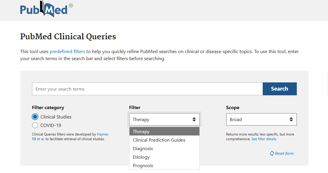 Vienas paprasčiausių būdų atlikti PubMed paiešką, tinkantis klinikinio tipo užklausoms – PubMed Clinical Queries. Tai specializuota paieška, su iš anksto nustatytomis filtrų grupėmis, leidžianti greitai gauti su konkrečia klinikine tema susijusių rezultatų. Į paieškos laukelį vedant raktažodžius, pateikiami juos konkretizuojančių sąvokų pasiūlymai. Įvestą užklausą galima sujungti su vienu iš penkių filtrų ir pasirinkti: ar norime platesnės paieškos, kuri duos daugiau, bet ne visada labai tikslių rezultatų, ar siauresnės – su mažiau, bet tiksliau užklausą atitinkančių straipsnių.