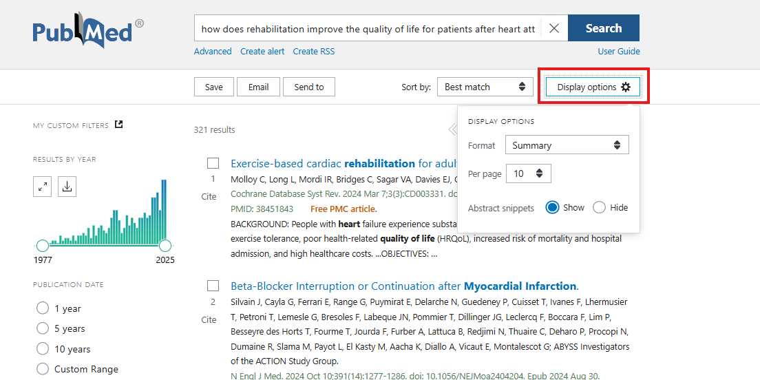 Atlikę paiešką ir gavę rezultatų sąrašą, galime pasirinkti, kaip rezultatai bus rikiuojami (Sort by), taip pat, kokį informacijos kiekį norėtume matyti rezultatų sąraše (Display options). Galime pasirinkti, ar norime matyti tik straipsnių pavadinimus ir autorių bei žurnalų informaciją, ar taip pat santrumpas, raktažodžius bei pilno teksto nuorodas. Taip pat galime rinktis, kiek rezultatų matysime viename puslapyje (nuo 10 iki 200).