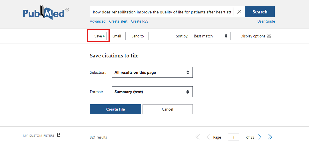 Savo išsaugotus įrašus visada galime rasti paspausdami ant savo vartotojo vardo viršutiniame dešiniajame PubMed lango kampe ir pasirinkdami „Publications“. Taip pat galime siųsti rezultatus el. paštu (ne daugiau, nei 200 vienu metu) arba išsaugoti juos kompiuteryje pasirinktu formatu.