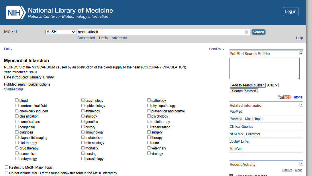 Jei nesame įsitikinę, koks turėtų būti konkretus MeSH terminas, galime pasinaudoti tezauru. Einame į puslapį https://www.ncbi.nlm.nih.gov/mesh/. Vedame dominantį terminą į paieškos laukelį, pvz. heart attack. Matome, kad ši frazė priskirta MeSH terminui Myocardial Infarction. Taip pat kiekvienam MeSH terminui priskiriamos ir rubrikos (subheadings), kurios leidžia patikslinti įrašą, pvz. diagnostika, reabilitacija, slauga (diagnosis, rehabilitation, nursing). Galime priskirti pasirinktam MeSH terminui aktualią rubriką, gautą konkretesnį terminą įtraukti į dešinėje esantį PubMed paieškos užklausos formavimo laukelį (Add to search builder), atlikti paiešką PubMed (Search PubMed). Taip pat galime jungti kelis MeSH terminus, pasinaudodami Būlio loginiais operatoriais (AND, OR, NOT).