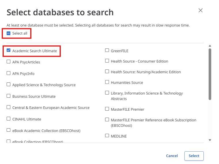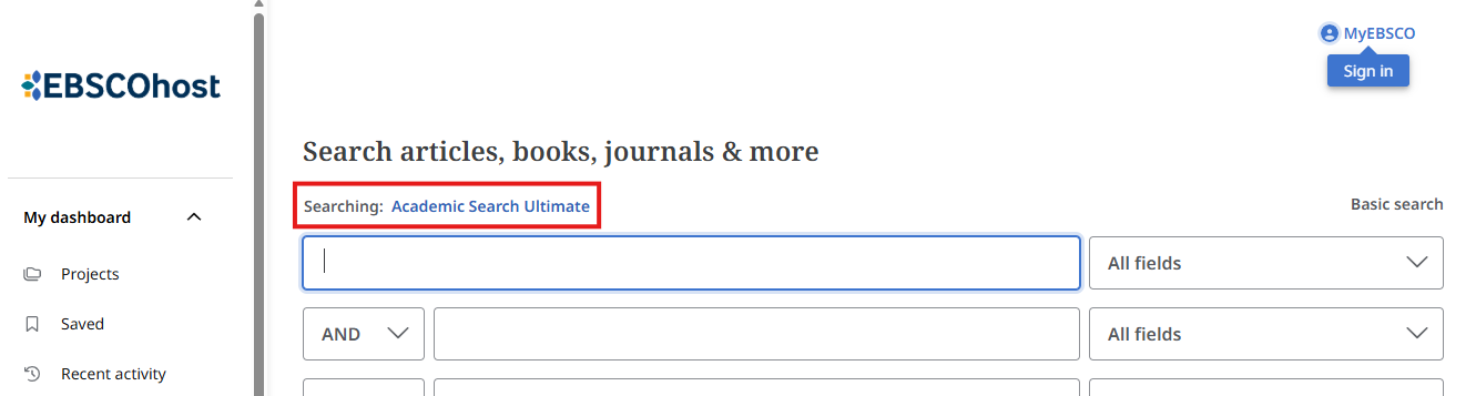 Academic Search Ultimate – tai VU prenumeruojama tarpdisciplininė duomenų bazė, kurioje galima rasti mokslinius straipsnius, knygų skyrius, konferencijų leidinius ir kitus akademinius šaltinius. Ši bazė apima įvairias disciplinas: socialinius ir humanitarinius mokslus, politiką, ekonomiką, verslą, edukologiją, technologijas, gamtos mokslus, mediciną ir sveikatos mokslus. EBSCO duomenų bazė turi eilę papildomų pobazių, vartotojui leidžiama pasirinkti kokiose informacijos šaltinių saugyklose norima ieškoti informacijos.
