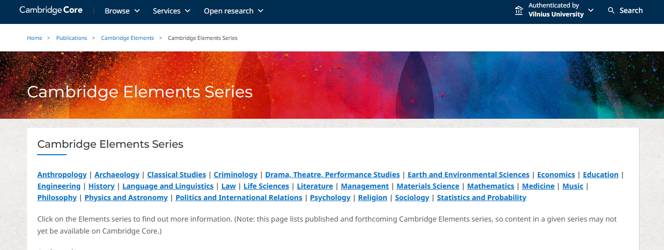 Platformoje taip pat pateikiamos specialios kolekcijos, pavyzdžiui, Cambridge Elements Series. Cambridge Elements Series – tai pagal įvairias temas suskirstytos originalios, glaustos ir patikimos studijos, parengtos tos srities ekspertų.