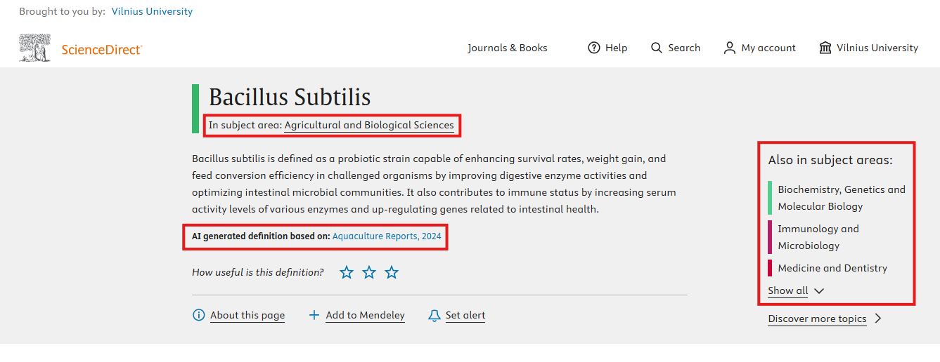 “Bacillus Subtilis“ temos puslapyje pateikiamas šaltinis, kuriuo remiantis sugeneruotas sąvokos aprašymas taip pat nurodoma termino sąsaja, su kitomis mokslo sritimis.
