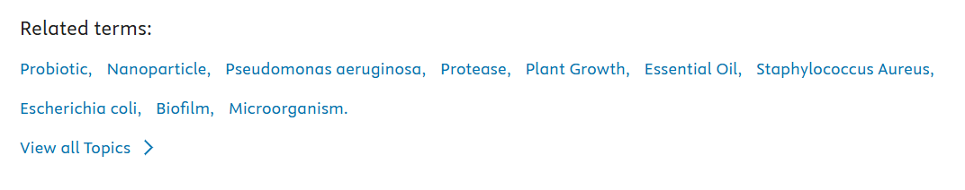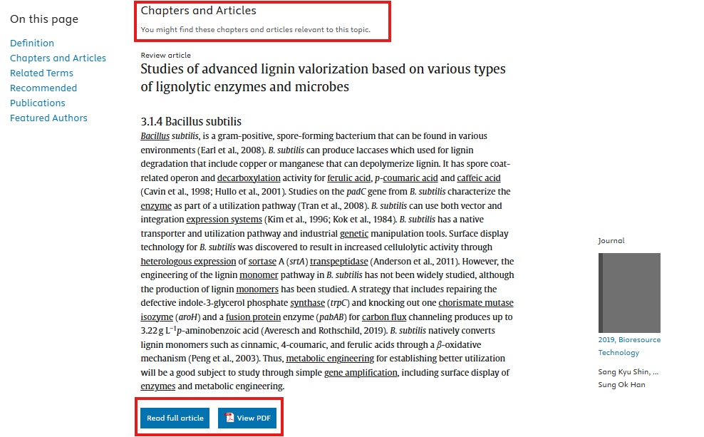 Terminų aprašymai sugeneruoti iš ScienceDirect publikuotų šaltinių, pasitelkiant DI, taip pat pateikiamos interaktyvios nuorodos, nukreipiančios į šaltinius. Be temos aprašymo, teminiuose puslapiuose pateikiami skirtingų tipų šaltiniai (enciklopedijos, straipsniai, knygų skyriai ir t.t.), susiję su aprašoma sąvoka.