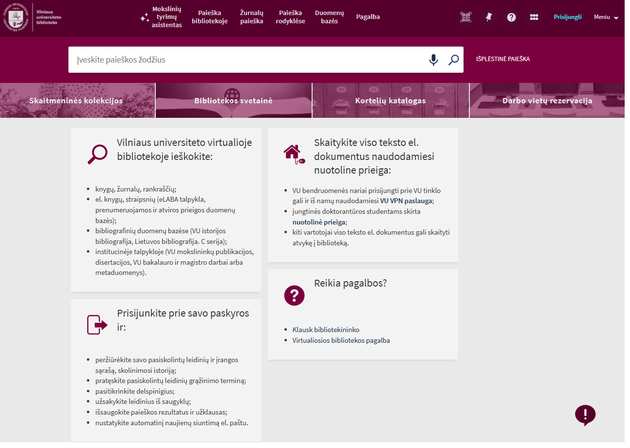 Vilniaus universiteto virtuali biblioteka (VB) – virtualibiblioteka.vu.lt Leidžia vienoje vietoje ieškoti VU bibliotekos saugomų spausdintų ir elektroninių šaltinių, taip pat jungiasi prie prenumeruojamų duomenų bazių.