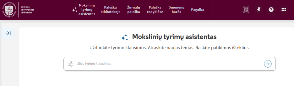 „Mokslinių tyrimų asistentas“ – tai generatyvinio dirbtinio intelekto (DI) įrankis, integruotas į Vilniaus universiteto virtualią biblioteką.